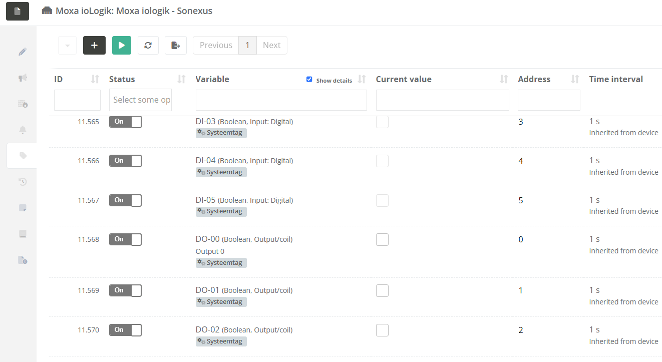 Step 4: After saving, the device will automatically create a list of Tags. These tags represent the available inputs and outputs on the Moxa ioLogik.  |
