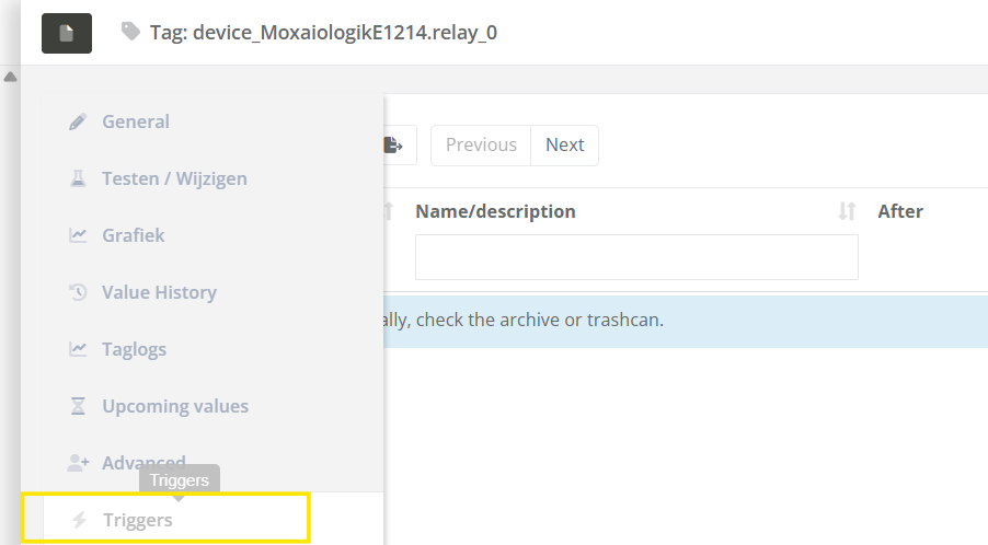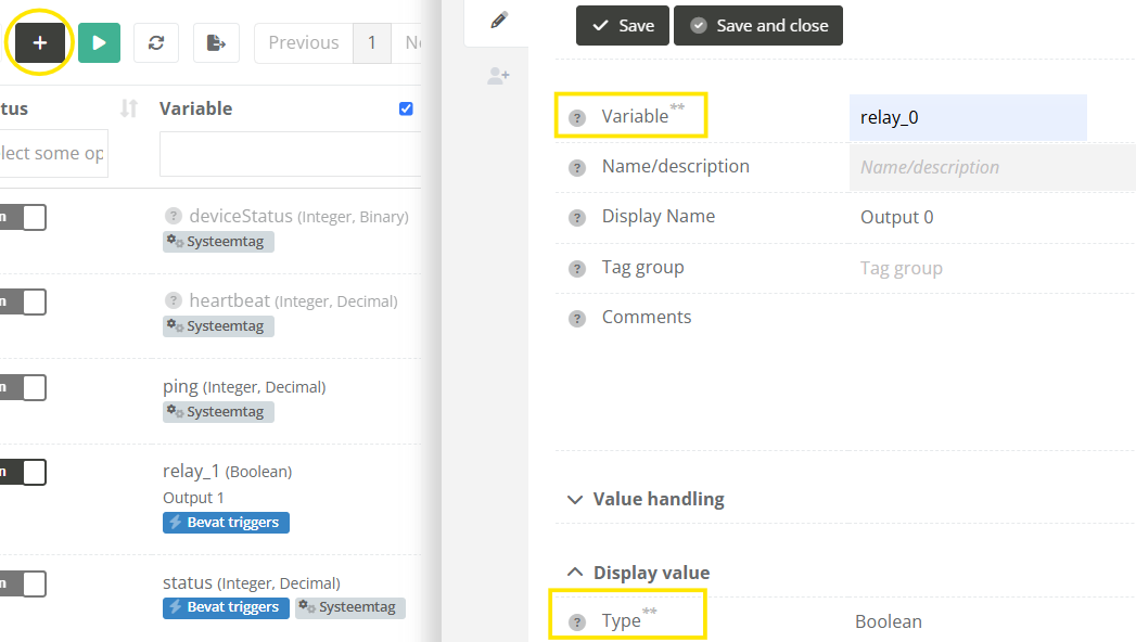 Step 2: Click on the new tag button, and name your tag "relay_<number>". Replace "<number>" with the relay you want to switch. Use 0 when you are unsure, since this relay is used the most in current implementations.