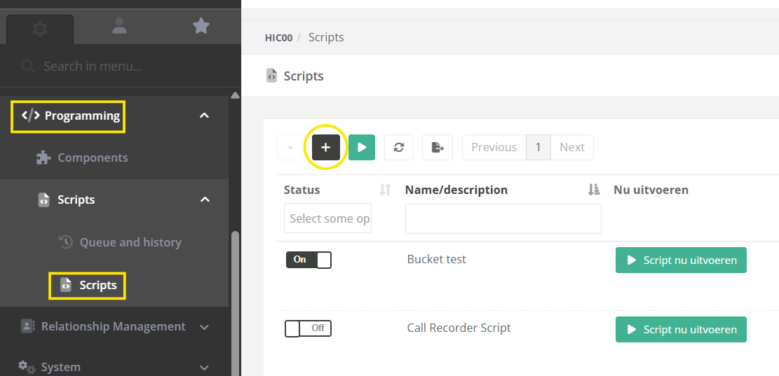 | Step 1: Navigate to "Programming / Scripts" (or "System / Scripts" in versions before 5.1.0), and click on the new script button. | |
