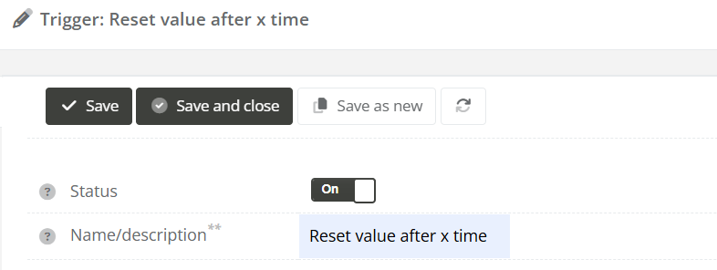 (Optional) Step 5: To make the relay switch back to 0 (off) x seconds after being switched to 1 (on), also add the following trigger (as configured in the image), and click on the "Save" or "Save and close" button.  |