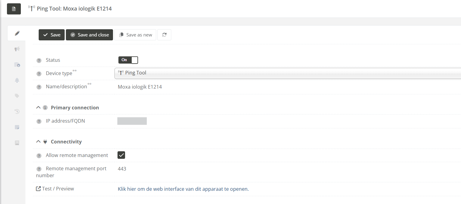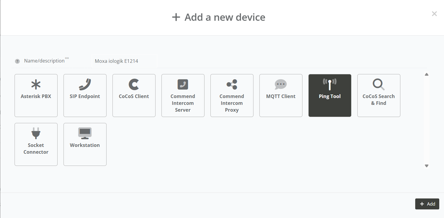 Step 2: Type a name for the device (like: "Location - MOXA ioLogik"), choose the "Ping tool" device type, and click on the add button.  |