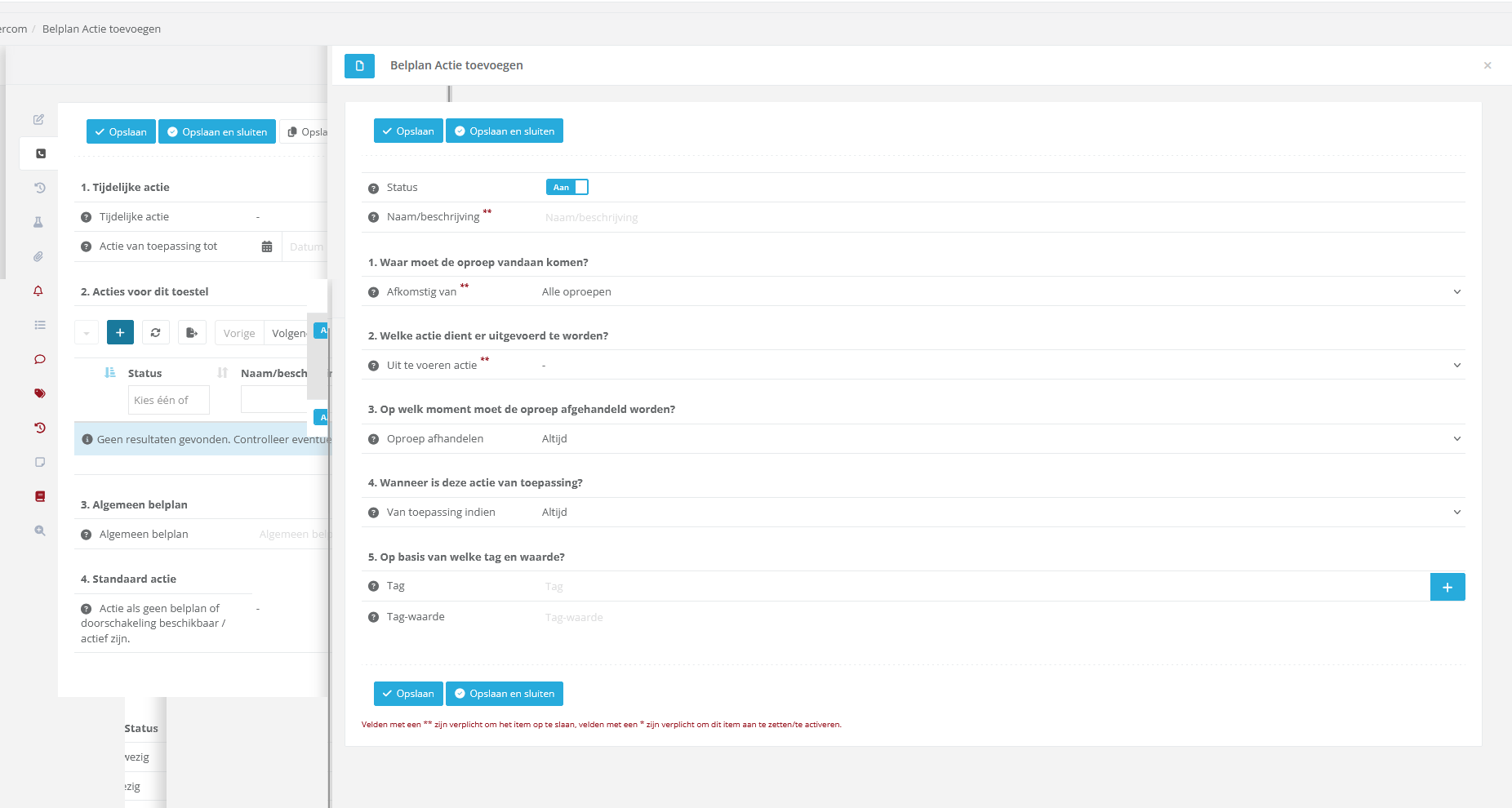 In nevenstaande geval is een vast nummer gekozen, maar het is ook mogelijk om een algemeen belplan toe te wijzen ipv een "actie" waarin de afhandeling is geconfigureerd voor knop 0. |