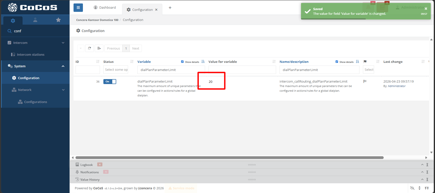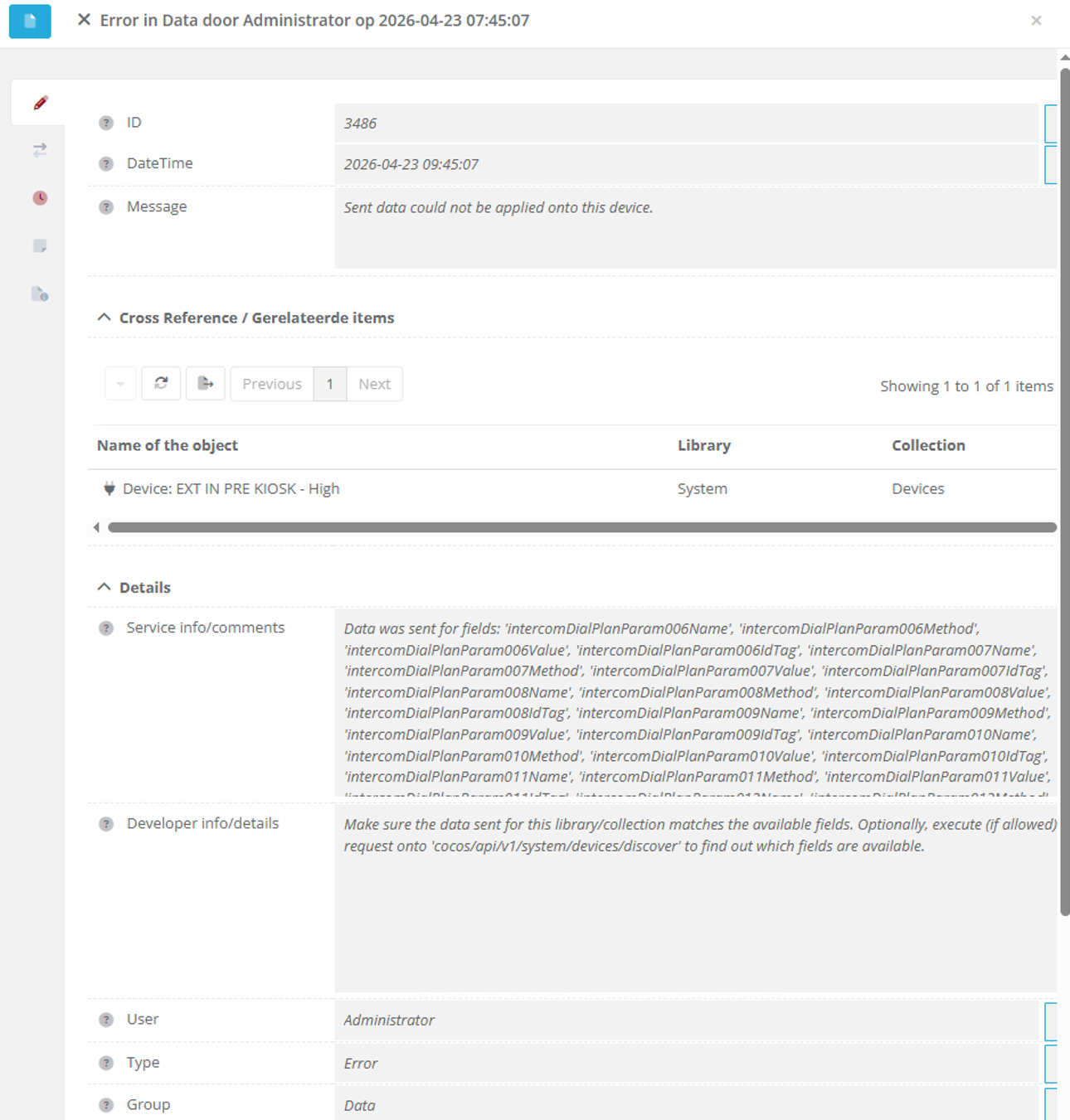 When saving a device, the error "Sent data could not be applied onto this device" is displayed. When opening the logMessage by clicking the link "Click here for more details", the service info/comments of the message give errors about fields like "intercomDialPlanParam006Name", "intercomDialPlanParam006Method",, "intercomDialPlanParam006Value", "intercomDialPlanParam006IdTag", "intercomDialPlanParam007Name", "intercomDialPlanParam007Method",, "intercomDialPlanParam007Value", "intercomDialPlanParam007IdTag", "intercomDialPlanParam008Name" and so on. See also the example below: